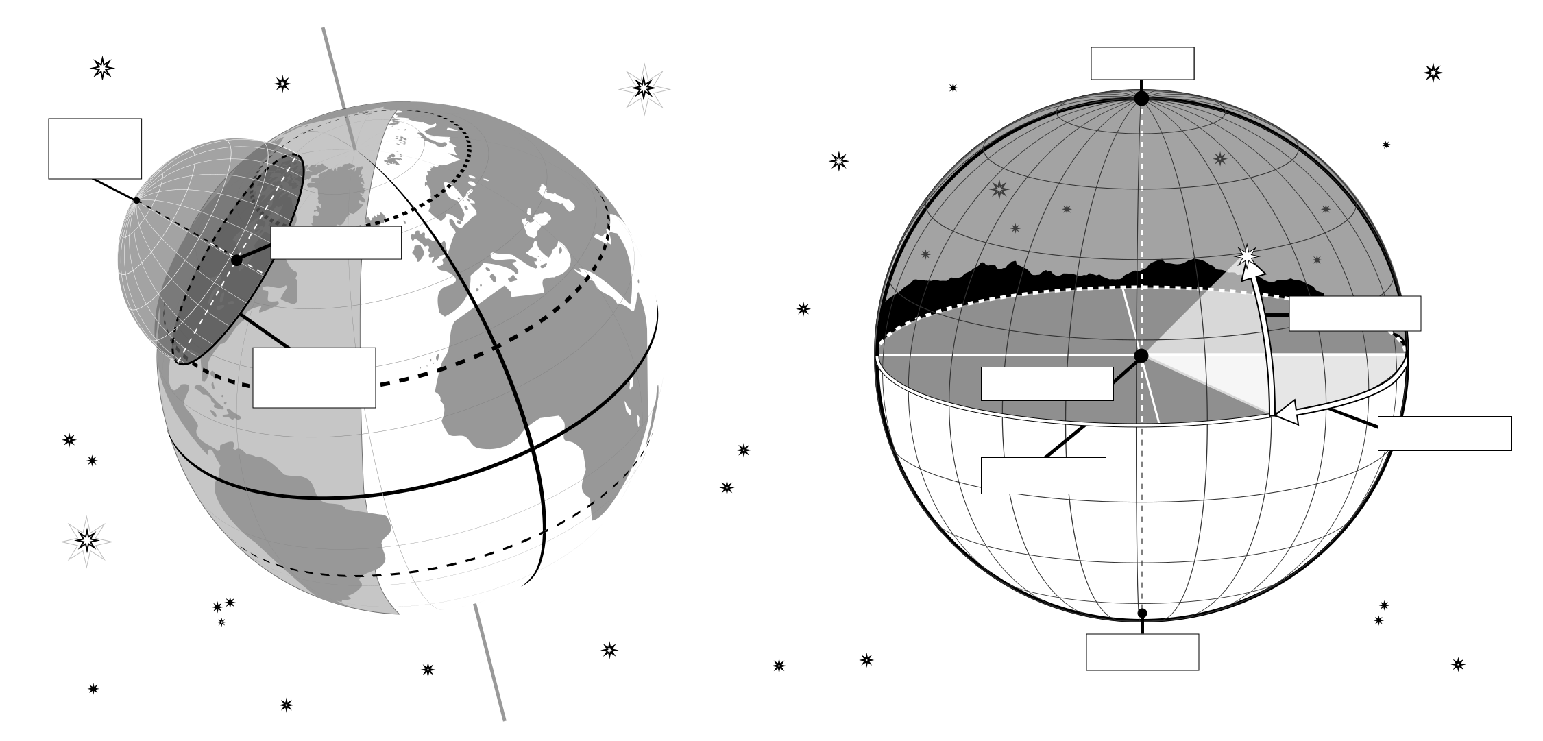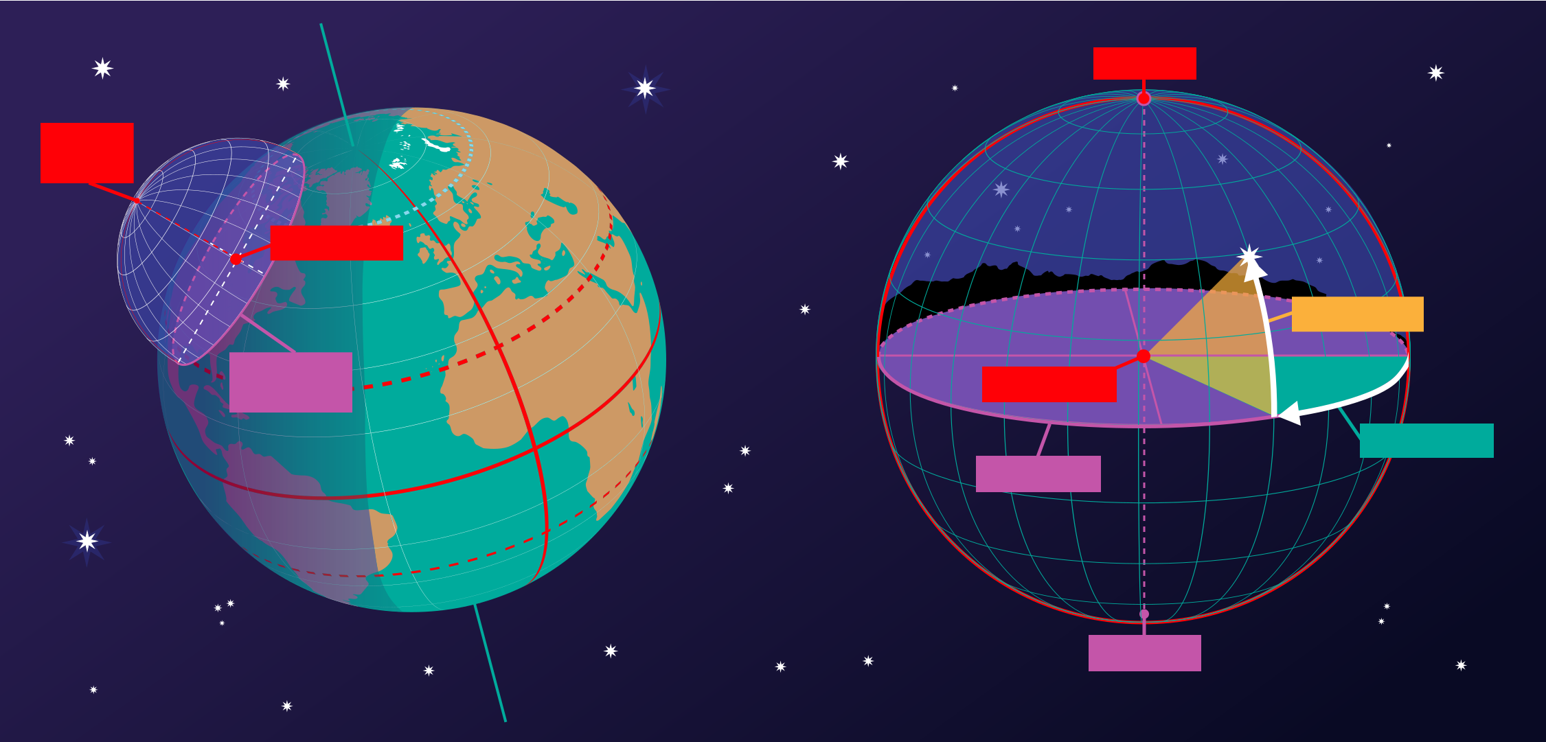 On the left-hand part of the diagram, we can see that when we put the observer and their local horizontal coordinate system in a global context, that the parts of the sky the observer can see depend on their position on the Earth and on the rotation of the Earth. The zenith points perpendicular to the Earth's surface so the position on the sky the zenith and nadir correspond to is dependent on the observer's latitude. The horizon also depends on the observer's position on the Earth.