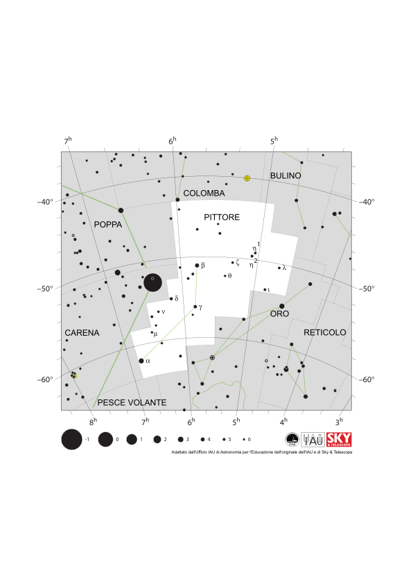 La costellazione del Pittore con le sue stelle luminose e le costellazioni circostanti. Il Pittore è circondato da (in senso orario dall'alto): Colomba, Bulino, Dorado, Pesce Volante, Carena e Poppa. Il Pittore si distingue per la sua seconda stella più luminosa, Beta Pictoris. Questa giovane stella ospita un grande disco di materiale polveroso lasciato dal processo di formazione dei pianeti insieme a due pianeti, uno dei quali, Beta Pictoris b, è stato uno dei primi pianeti a essere fotografato direttamente dagli astronomi.