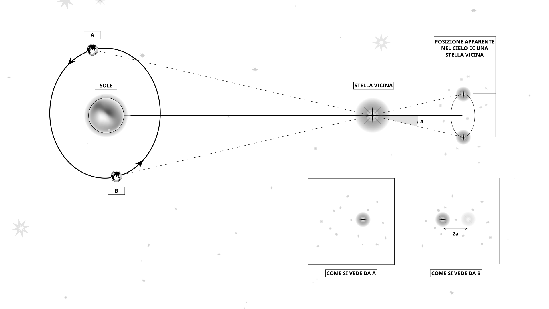 Lo spostamento di posizione è noto come parallasse trigonometrica o annuale (che chiameremo qui α) ed è definito come lo spostamento di posizione di una stella rispetto a ciò che vedrebbe un osservatore al centro del Sistema Solare (il Sole). In questo diagramma vediamo la stella vista da due prospettive distanti sei mesi l'una dall'altra (posizioni A e B). Se osservata dalla posizione A, lo spostamento della stella sarà α, mentre se osservata dalla posizione B sarà –α. Pertanto, la differenza relativa nella posizione della stella tra l'osservazione dalla posizione A e quella dalla posizione B sarà 2α.