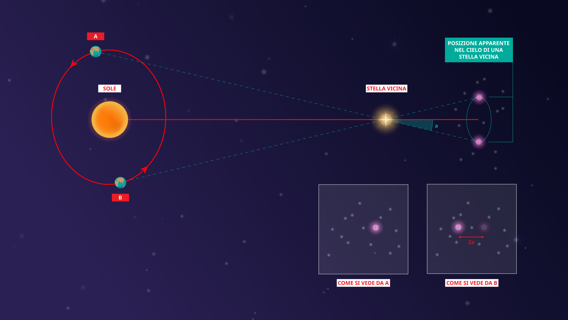 Didascalia: La determinazione delle distanze ha rappresentato storicamente una sfida per l'astronomia. Uno dei metodi principali per misurare le distanze consiste nell'utilizzare la parallasse annuale. La Terra orbita attorno al Sole nel corso di un anno, il che significa che si sposta da un lato del Sole (qui indicato come posizione A) all'altro (posizione B) nell'arco di sei mesi. Nei sei mesi restanti, torna poi alla sua posizione iniziale. Questo movimento modifica leggermente la prospettiva da cui un osservatore sulla Terra vede il cielo notturno. È simile al cambiamento di prospettiva che si nota quando si osserva una scena prima con l'occhio sinistro e poi con il destro. Il cambiamento di prospettiva fa sì che gli oggetti vicini cambino posizione nella propria visione. Il moto annuale della Terra attorno al Sole modifica la prospettiva dell'osservatore in misura sufficiente da spostare le posizioni osservate degli oggetti celesti. L'entità di questo effetto dipende dalla distanza dall'oggetto celeste. Le stelle vicine avranno spostamenti di posizione osservati maggiori rispetto alle stelle più lontane.