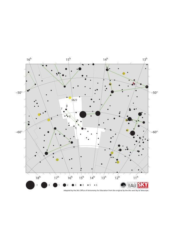 The open cluster NGC 5823 lies in Circinus and is marked here with a yellow circle.