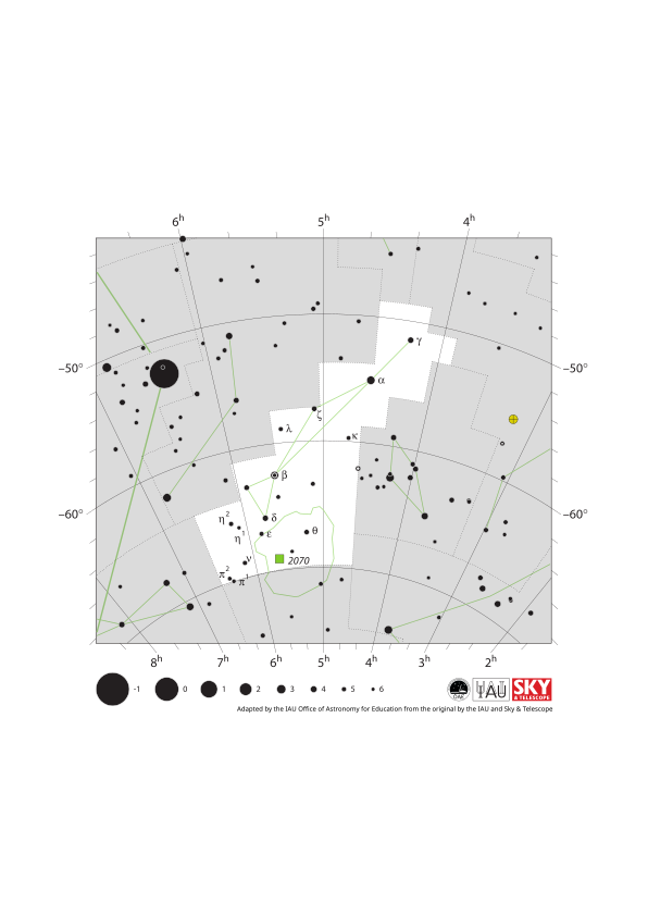 The constellation Dorado with its bright stars and surrounding constellations. Dorado is surrounded by (going clockwise from the top): Pictor, Caelum, Horologium, Reticulum, Hydrus, Mensa and Volans.