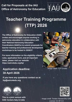 The Office of Astronomy for Education (OAE) invites and encourages anyone working in astronomy education together with their National Astronomy Education Coordinators (NAECs) to submit proposals for financial support of up to 2000 Euros for an astronomy teacher training and professional development workshop to be scheduled in 2026 or early 2027.