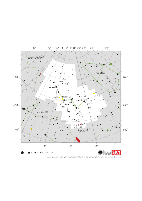 كوكبة كاسيوبيا او ذات الكرسى مع نجومها اللامعة والمجموعات النجمية المحيطة بها. يحيط بكوكبة كاسيوبيا (في اتجاه عقارب الساعة من الأعلى): كوكبة سيفيوس، وكوكبة أندروميدا، وكوكبة بيرسيوس، وكوكبة كاميلوبارداليس.