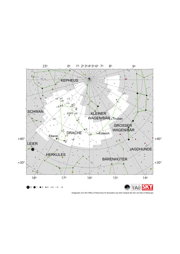 Das Sternbild Drache mit seinen hellen Sternen und den umliegenden Sternbildern. Draco ist im Uhrzeigersinn von oben aus gehend umgeben von Kepheus, Kleiner Wagen (auch kleiner Bär genannt), Bärenhüter, Herkules, Leier und Schwan.