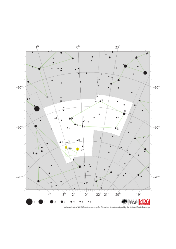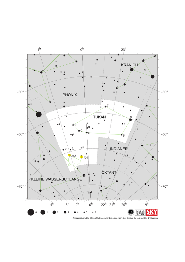 Die Kleine Magellansche Wolke (SMC), eine Satellitengalaxie der Milchstraße, liegt im Tukan, wobei ein kleiner Teil in das benachbarte Sternbild der Kleinen Wasserschlange übergreift. Die SMC ist hier mit einer grünen Schleife im Südosten vom Tukan markiert. Die Sternhaufen NGC 104, auch bekannt als 47 Tucanae oder 47 Tuc, und NGC 362 liegen im Tukan und sind hier mit gelben Kreisen mit eingeblendeten Pluszeichen markiert. Obwohl diese beiden Sternhaufen am Himmel nahe der SMC erscheinen, sind sie beide deutlich näher als die Satellitengalaxie.