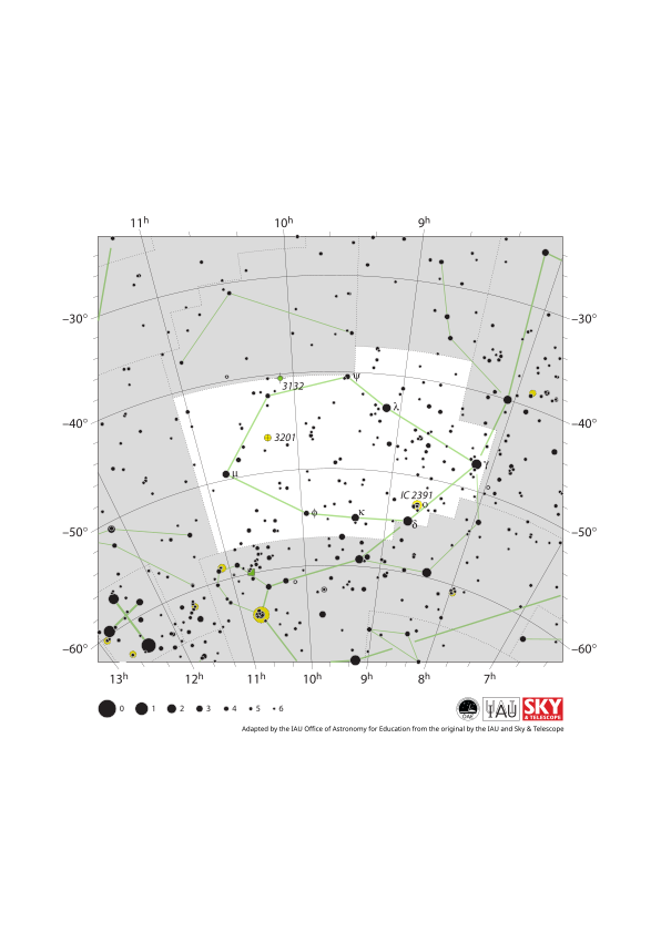 Der Planetarische Nebel NGC 3132 liegt im Segel und ist hier mit einem grünen Kreis über einem Pluszeichen markiert. Der Kugelsternhaufen NGC 3201 befindet sich ebenfalls im Segel und ist hier mit einem gelben Kreis mit darüber liegendem Pluszeichen markiert. Ein gelber Kreis markiert die Position des offenen Sternhaufens IC 2391.