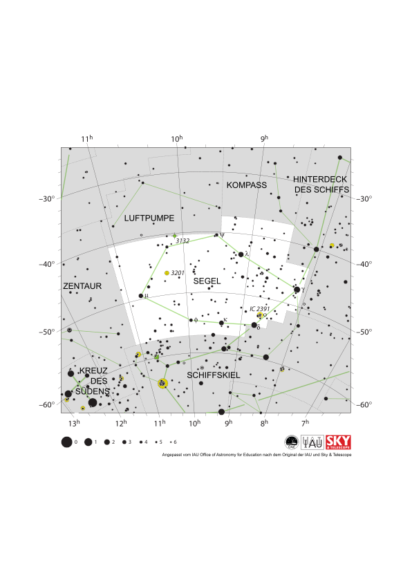 Die y-Achse dieses Diagramms ist in Deklinationsgraden mit Norden nach oben und die x-Achse ist in Rektaszensionsstunden mit Osten nach links angegeben. Die Größe der hier markierten Sterne bezieht sich auf die scheinbare Helligkeit des Sterns. Je größer die Punkte, desto heller scheinen die Sterne die sie darstellen. Die griechischen Buchstaben kennzeichnen die hellsten Sterne des Sternbildes. Diese sind nach Helligkeit geordnet, wobei der hellste Stern mit Alpha, der zweithellste mit Beta usw. bezeichnet wird, obwohl diese Reihenfolge nicht immer genau eingehalten wird. Das Segel war früher zusammen mit dem Hinterdeck des Schiffes und dem Schiffskiel Teil des größeren Sternbilds Schiff Argo. Da die Buchstabenbezeichnungen für die Sterne vor dieser Aufteilung geschaffen wurden, sind die griechischen Buchstabenbezeichnungen jetzt zwischen den drei Sternbildern aufgeteilt, wobei das Segel Sterne mit den Bezeichnungen Gamma und Delta, aber nicht Alpha oder Beta hat. Die gepunkteten Begrenzungslinien markieren die IAU-Grenzen der Sternbilder, und die durchgezogenen grünen Linien markieren eine der üblichen Formen, die zur Darstellung der Figuren der Sternbilder verwendet werden. Weder die Sternbildgrenzen noch die Linien, die die Sterne verbinden, sind am Himmel zu sehen.