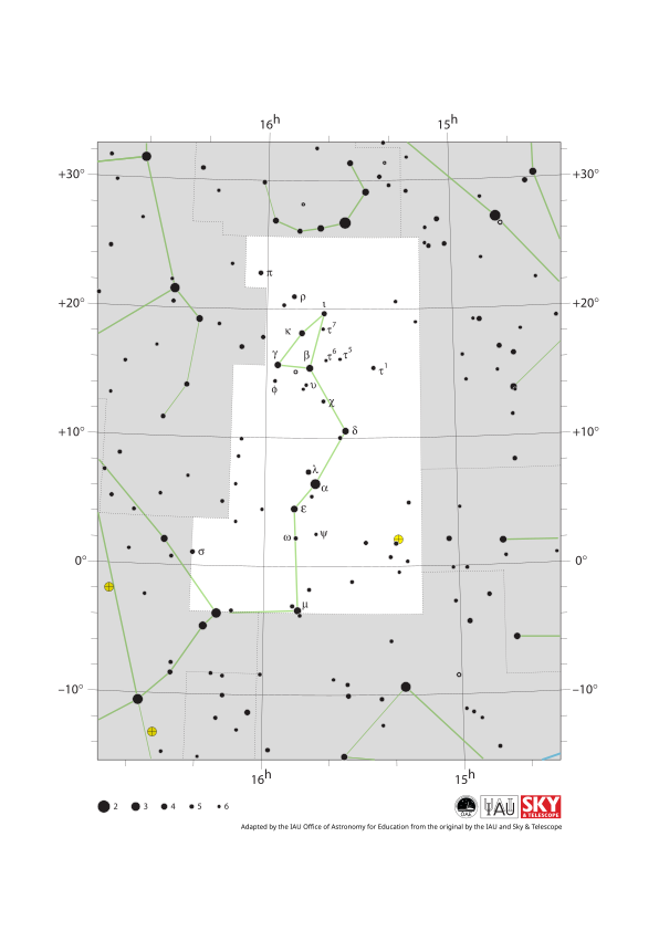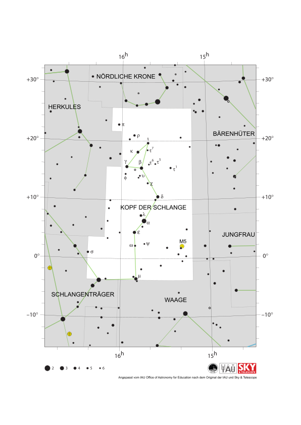 Eine Karte eines Teils des Sternbilds Schlange. Schlange ist einzigartig unter den IAU-Sternbildern, da es in zwei nicht zusammenhängende Teile unterteilt ist. Der hier gezeigte Teil der Schlange ist als Kopf der Schlange bekannt und stellt ebendiesen dar. Dieser Teil der Schlange ist von oben im Uhrzeigersinn ausgehend umgeben von der Nördlichen Krone, Bärenhüter, Jungfrau, Waage, Schlangenträger und Herkules.