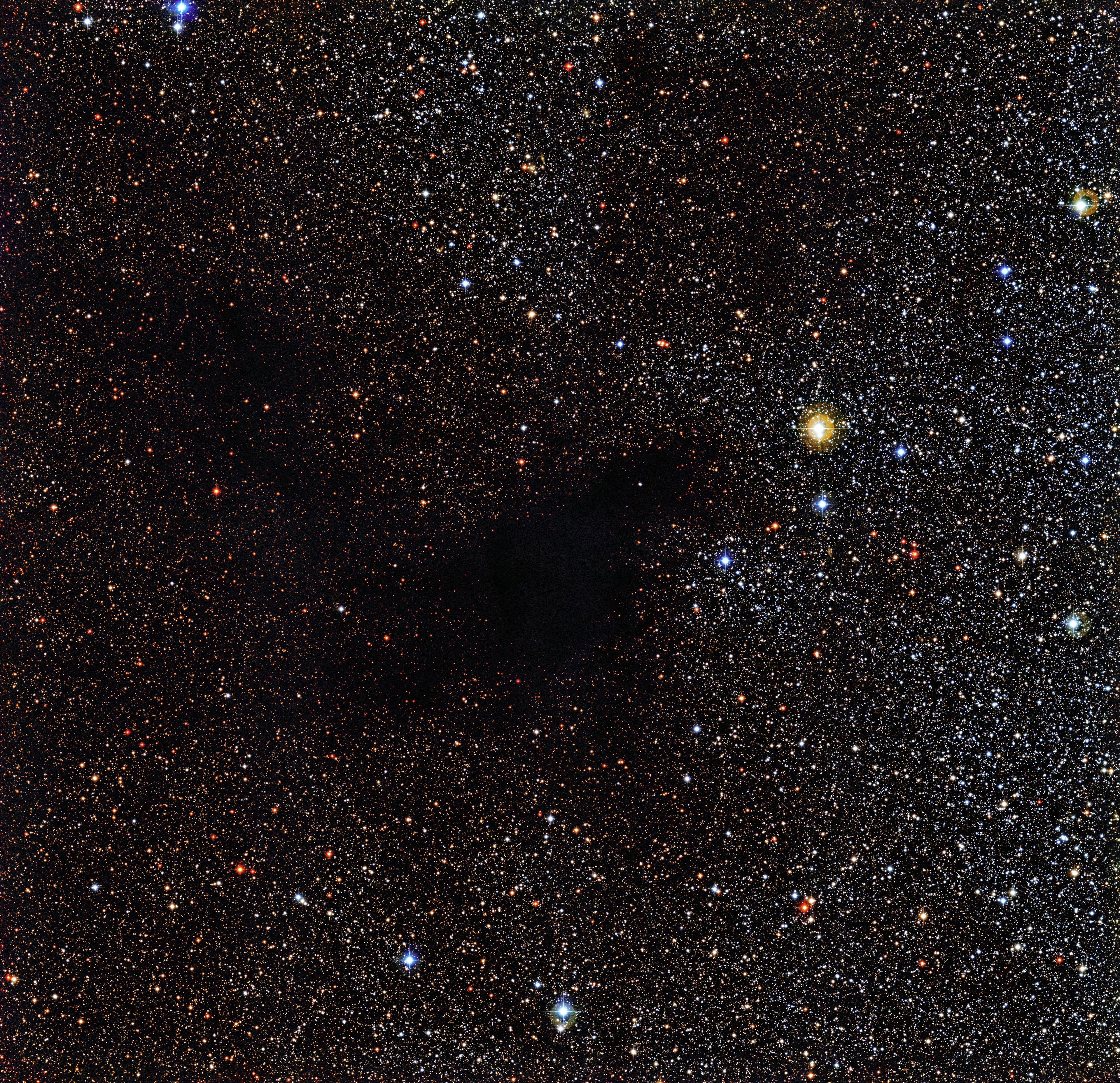 This image shows a dark molecular cloud known as LDN 483, captured by the Wide Field Imager on the MPG/ESO 2.2-metre telescope at the La Silla Observatory in Chile. At first glance, the patch of sky looks like a region where stars are missing, but the effect is due to interstellar extinction — dust and gas within LDN 483 absorb and scatter light from background stars, making them appear faint or invisible to telescopes that observe visible light. Interstellar extinction is the dimming of light from distant objects caused by dust and gas between the object and the observer, a common phenomenon in astronomy that must be accounted for when measuring stellar brightness and color.