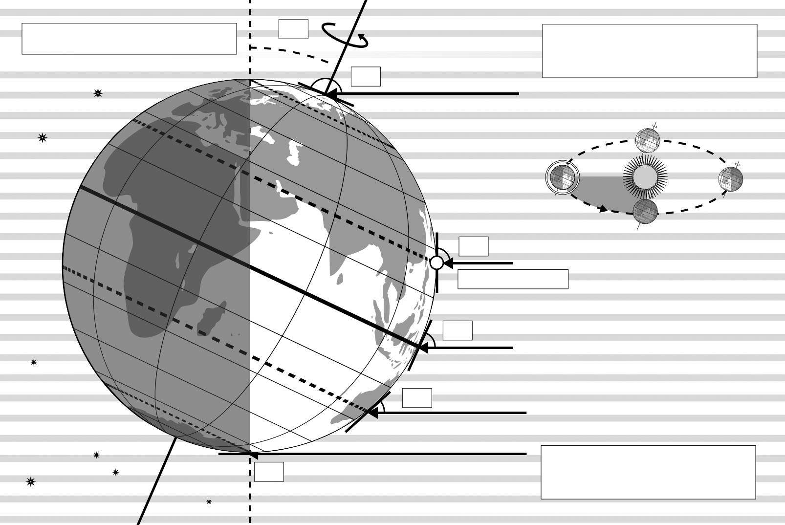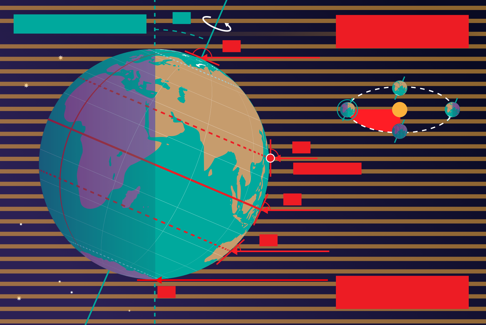 Questo diagramma mostra la Terra al solstizio di giugno, noto come solstizio d’estate nell’emisfero boreale e solstizio d’inverno nell’emisfero australe. L’asse di rotazione della Terra è inclinato di 23,4° rispetto all’asse dell’orbita terrestre attorno al Sole. Qui vediamo la luce del Sole rappresentata da linee parallele; nel diagramma il Sole si troverebbe molto lontano dal bordo destro. Cinque linee sono contrassegnate da angoli. Queste linee colpiscono la Terra a latitudini particolari. Dall'alto verso il basso, queste linee colpiscono la Terra al Polo Nord, al Tropico del Cancro, all'Equatore, al Tropico del Capricorno e al Circolo Polare Antartico. Le linee sono mostrate mentre colpiscono la Terra alla longitudine dove è attualmente mezzogiorno. Per le ultime quattro linee, gli angoli indicati mostrano l'angolo sopra l'orizzonte (l'altitudine) a cui il Sole appare nel cielo a mezzogiorno locale.