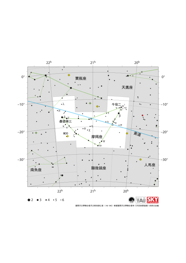 在摩羯座的東南方,即圖中的左下方,可以看到球狀星團M30,在圖中以疊加了十字符號的黃色圓圈標注。